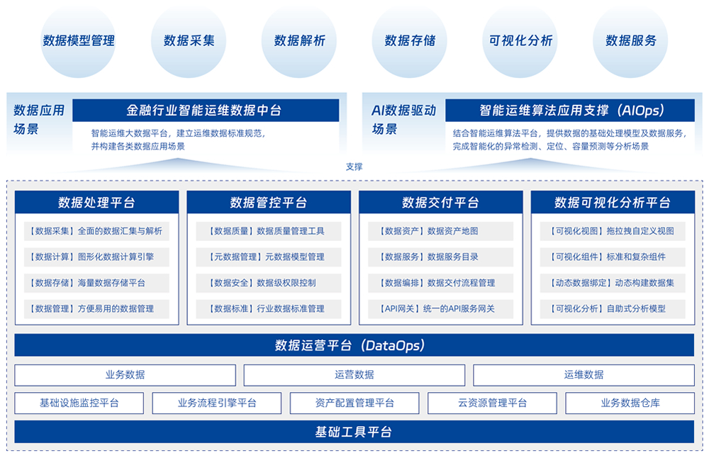 通過平臺整合各種運維工具的數據和服務能力,在保證數據隱私和安全的前提下,通過大數據技術等手段,來解決 IT 系統運行過程中產生的海量數據分析問題,并將分析結果通過數據共享服務提供給各類上層應用,幫助 IT 運維和管理人員全面了解系統運行狀態,提升可用性。