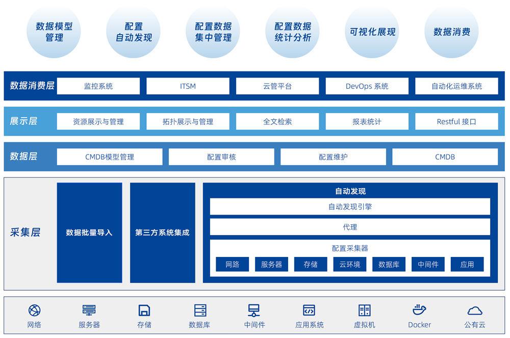 幫助用戶建立統(tǒng)一的運(yùn)維主數(shù)據(jù),通過(guò)各種自動(dòng)化手段實(shí)現(xiàn)以應(yīng)用為核心的全面資源管理以及運(yùn)維消費(fèi)場(chǎng)景共享。系統(tǒng)具備靈活的 CMDB 分層建模和配置信息維護(hù)機(jī)制,可以提供面向業(yè)務(wù)的 IT 架構(gòu)畫(huà)像,為各個(gè)運(yùn)維工具提供集中化的資源信息管理和協(xié)同,為 IT 運(yùn)維和 DevOps 體系下的各種運(yùn)維場(chǎng)景提供數(shù)據(jù)消費(fèi)服務(wù)。