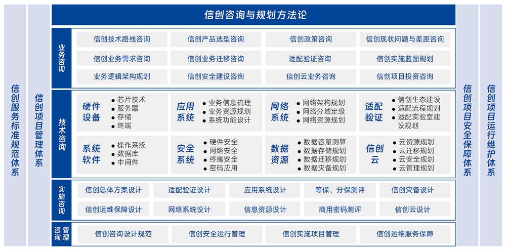 遵循國家信創政策要求,基于咨詢項目特點,采用國際先進、成熟的咨詢規劃方法,借鑒信創工程最佳實踐,開展頂層咨詢設計。