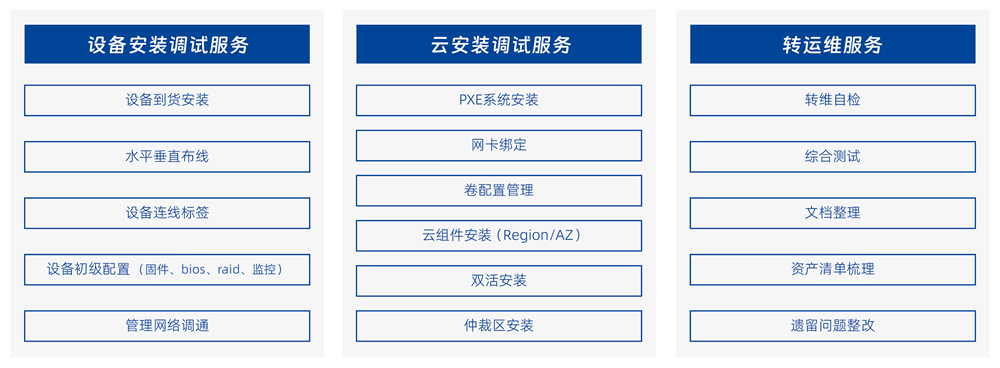設備上架加電、布線插纖及標簽黏貼、服務器產品初始化、網絡產品開局、系統推送及各批次網絡割接。